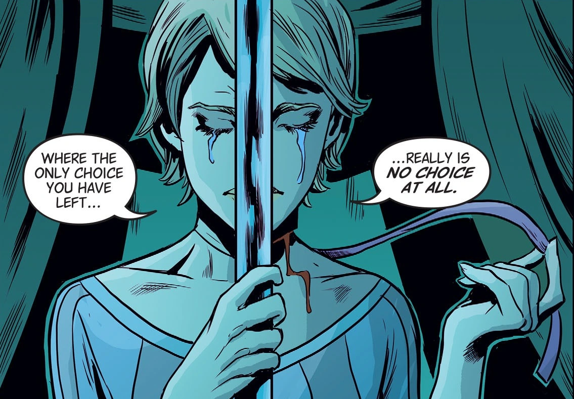 Bigby refuses to end Vivian's life, but she backs away and states that the girls that were killed were like family to her and no one was supposed to die. She admits that she hates herself when looking at the other employees at the club — Hans, Gwen and Nerissa — as she only sees the pain she's caused them through her curse. She pulls her own ribbon off, committing suicide. As her head separates from her body, the enchantment is broken.[1]