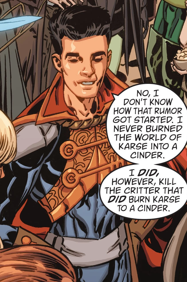 At the latest Wolf family reunion, about a millennia after the Battle of Fabletown, Connor explains to some partygoers about how one of his more memorable adventures resulted in his slaying of the monster that burned the world of Karse to a cinder and how he himself wasn't responsible for that world's destruction.[9]