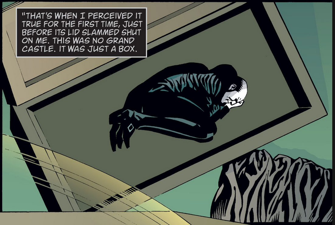 | “ | And then I noticed, as if for the first time, a place of refuge. It called to me, offering its thick stone ramparts, its towers and bastions. A mighty fortress, within which I could rest and recover my strength. Foolishly I entered, seeking only a quick respite before continuing again my predation among the Boxers. That's when I perceived it true for the first time, just before its lid slammed shut on me. This was no grand castle. It was just a box. A tiny and simple stone box. | „ |