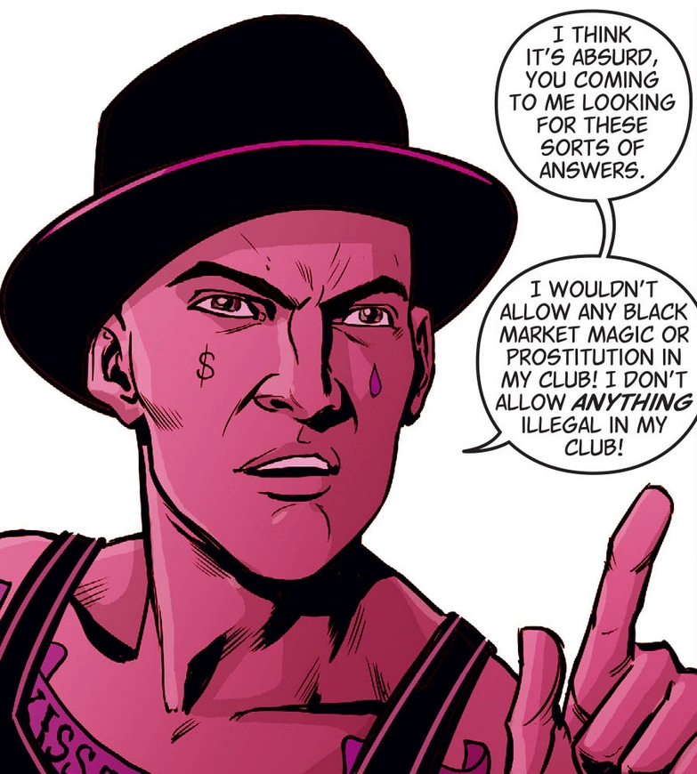 During the investigation of Lily's murder, Sheriff Bigby Wolf arrives at the Pudding & Pie, where Georgie, the owner, can be seen berating Nerissa as he tries to coach her on her lackluster pole dancing. He informs Bigby that the club is not open and proceeds to taunt him regarding his appearance and speech. He refuses to cooperate with the sheriff's questioning, acknowledging that Lily was employed at the establishment but asserting that he has no knowledge of her murderer. Georgie also asserts his ignorance regarding the origin of Lily's illicit glamour. He firmly states that his club strictly prohibits any involvement with the black market, prostitution, or any other unlawful activities. Despite this, he openly confesses his indifference towards Lily's demise. Bigby is aware that Georgie is withholding information from him, so he swiftly seizes a wooden paddle hanging on the wall and proceeds to demolish various objects within the club.[1]