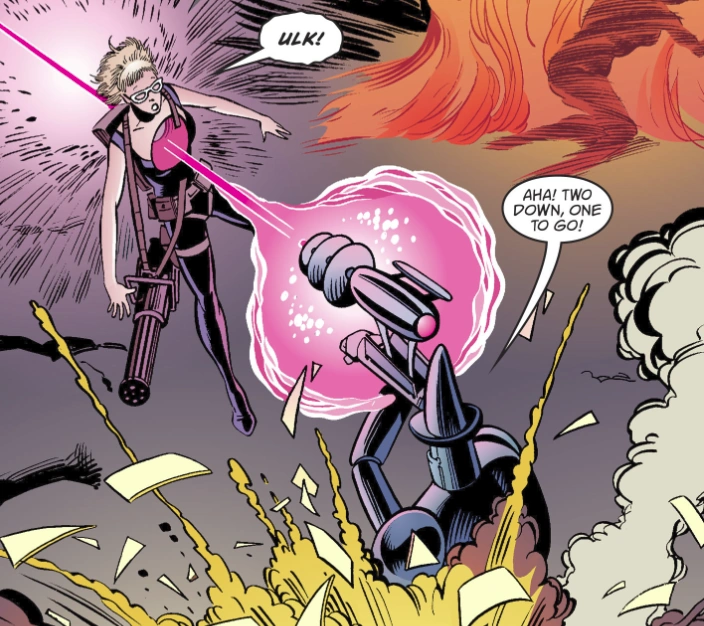 The sisters arrive at the same times as several former Golden Boughs prisoners, who were on a quest of their own, searching for Fabletown. The sisters go after the books while shooting at the dragon, which makes the dragon burn the books — he is tired of them anyway. The sisters, upset at the loss of the books, start shooting everyone around them. They are so enraged they apparently don't realize their own nephew, Jack Frost, has returned to fight and kill his own father unknowingly. Some of the Fables retaliate, and Hillary is shot to death by the Tin Woodman's raygun.[3]