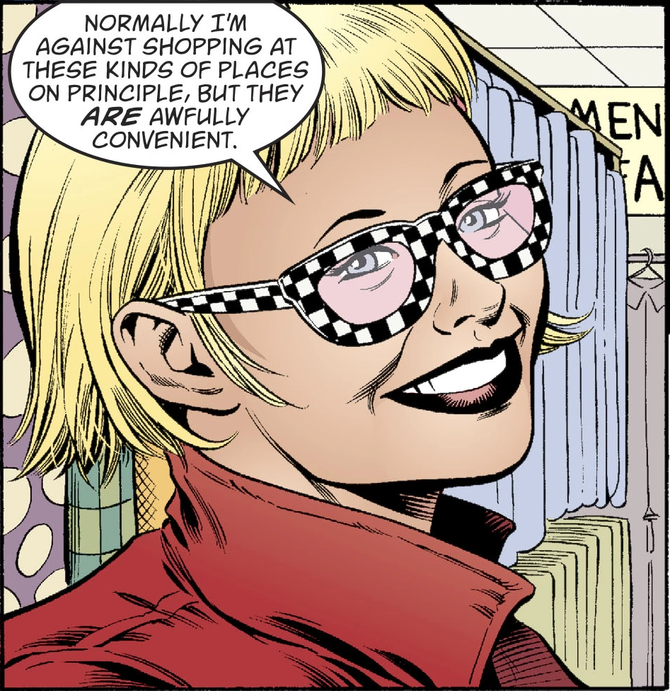 She'd stalk Fables tirelessly through books, magazines and newspapers, believing that if she couldn't be a Fable herself, at least she could surround herself with them. At one point, she begged Alice, a prisoner at the Golden Boughs, to recite one of her lines from the book Alice's Adventures in Wonderland, "Curiouser and curiouser."[14]