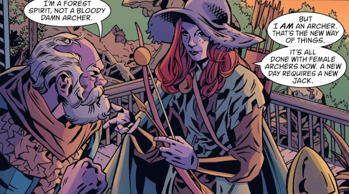 However, their conversation is abruptly interrupted when the new Jack in the Green arrives at the Last Story Home. The new Jack introduces herself to her predecessor, and announces that she is his replacement. The old Jack refuses to accept this, and is also taken aback by the discovery that his successor has a talent for archery, as he sees himself more as a "forest spirit" than a skilled marksman. The new Jack claims that the job has transformed, and current circumstances necessitate a female archer to fill the position.[1]