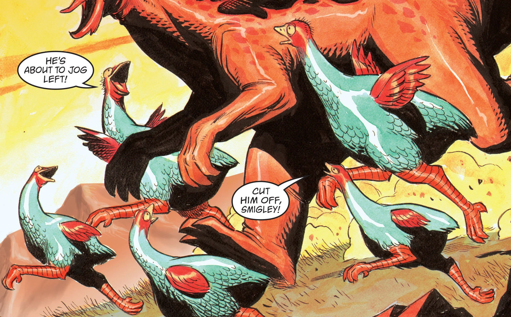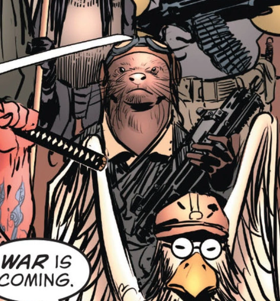 When Snow White arrives for her biannual inspection at the Farm, two Winged Monkeys are seen joining other Farm animals in the barn to discuss ways to fight against and reclaim the Homelands from the Adversary.[34] As seen in later issues, the Winged Monkeys in the Homelands are all working in the Nome King's air corps. One of them discovers Bufkin's group of revolutionaries in Ev, and is subsequently killed by Bufkin. | |