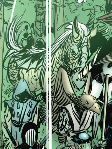| Korob Birds appear in Fables #124 — "After" and are gigantic avian creatures that hunt in packs and lay large clutches of eggs at a time. Bufkin and Lily Martagon were turned into Korob Birds when they both got a huge dose of Umpamas Gas, as this particular gas is wont to do. This resulted in hundreds of offspring. However, the effect eventually wore off. | |