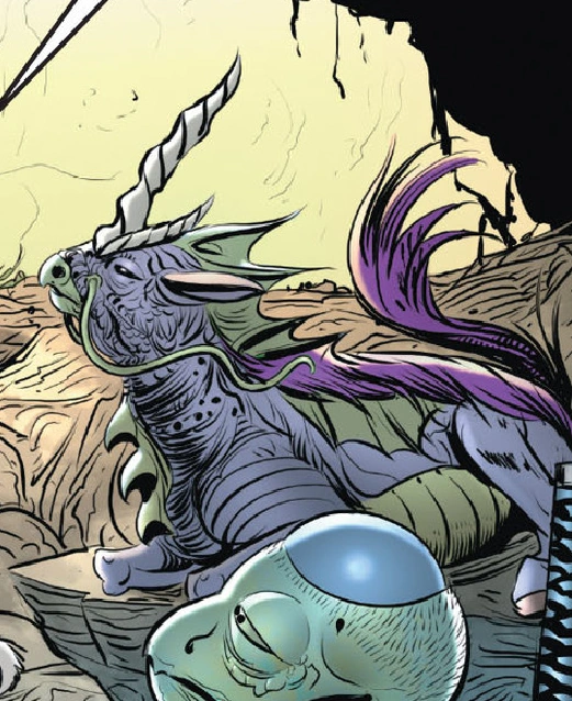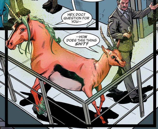 | The Pushmi-Pullyu is a creature who appears indirectly in Everafter: From the Pages of Fables #2 — "Train In Vain: Chapter Two of The Pandora Protocol." Connor Wolf briefly shapeshifts into one after Dolittle tells him that it is his favorite animal. | |