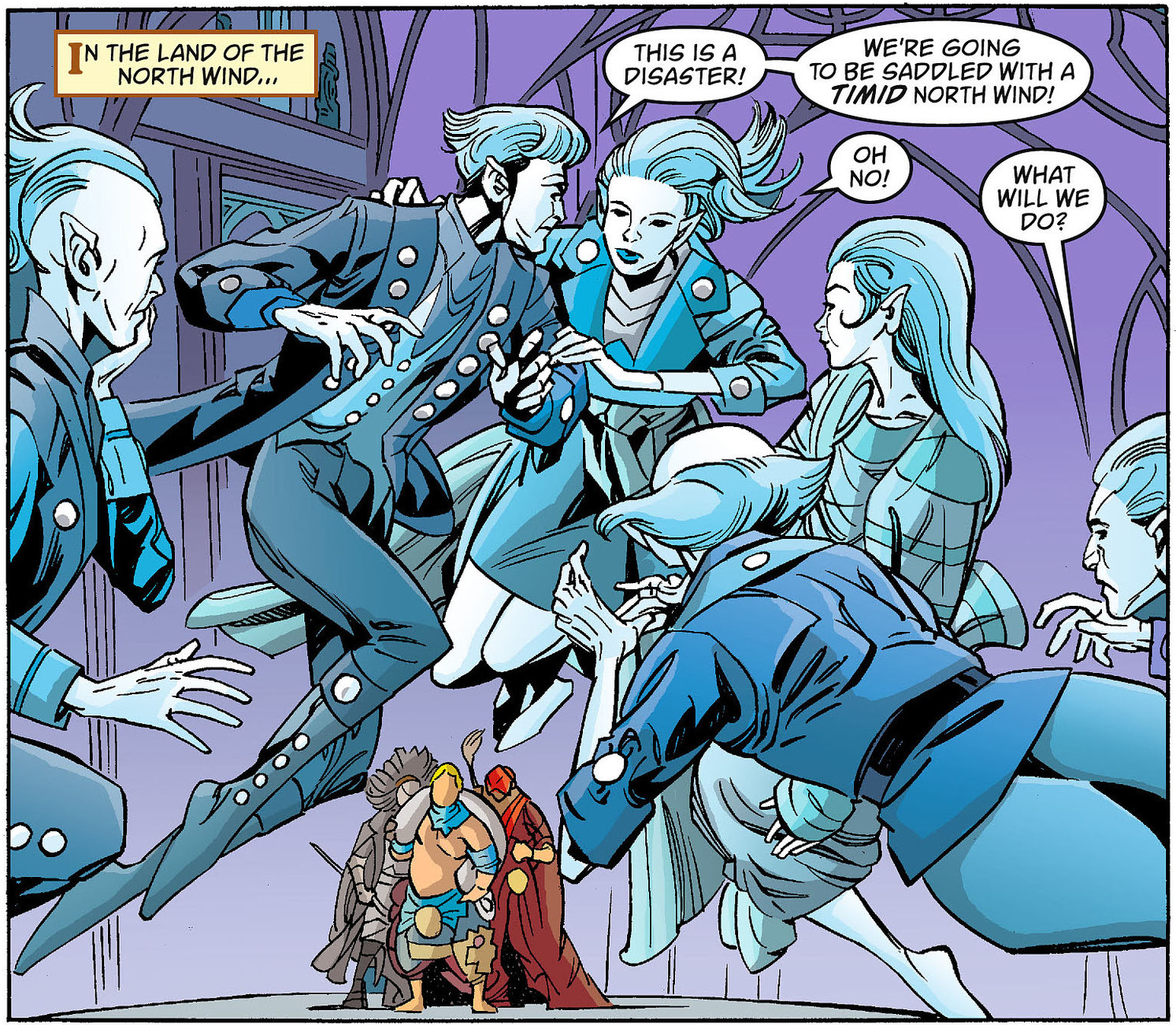 The cardinal winds as a group are based on the anemoi from Greek mythology, as each of them are named after their Greek counterpart. As implied in Fables: The Last Castle, and confirmed in Fables #99 — "Dark City," they are also based on the four winds from the Norwegian fairy tale of "East of the Sun and West of the Moon." | |