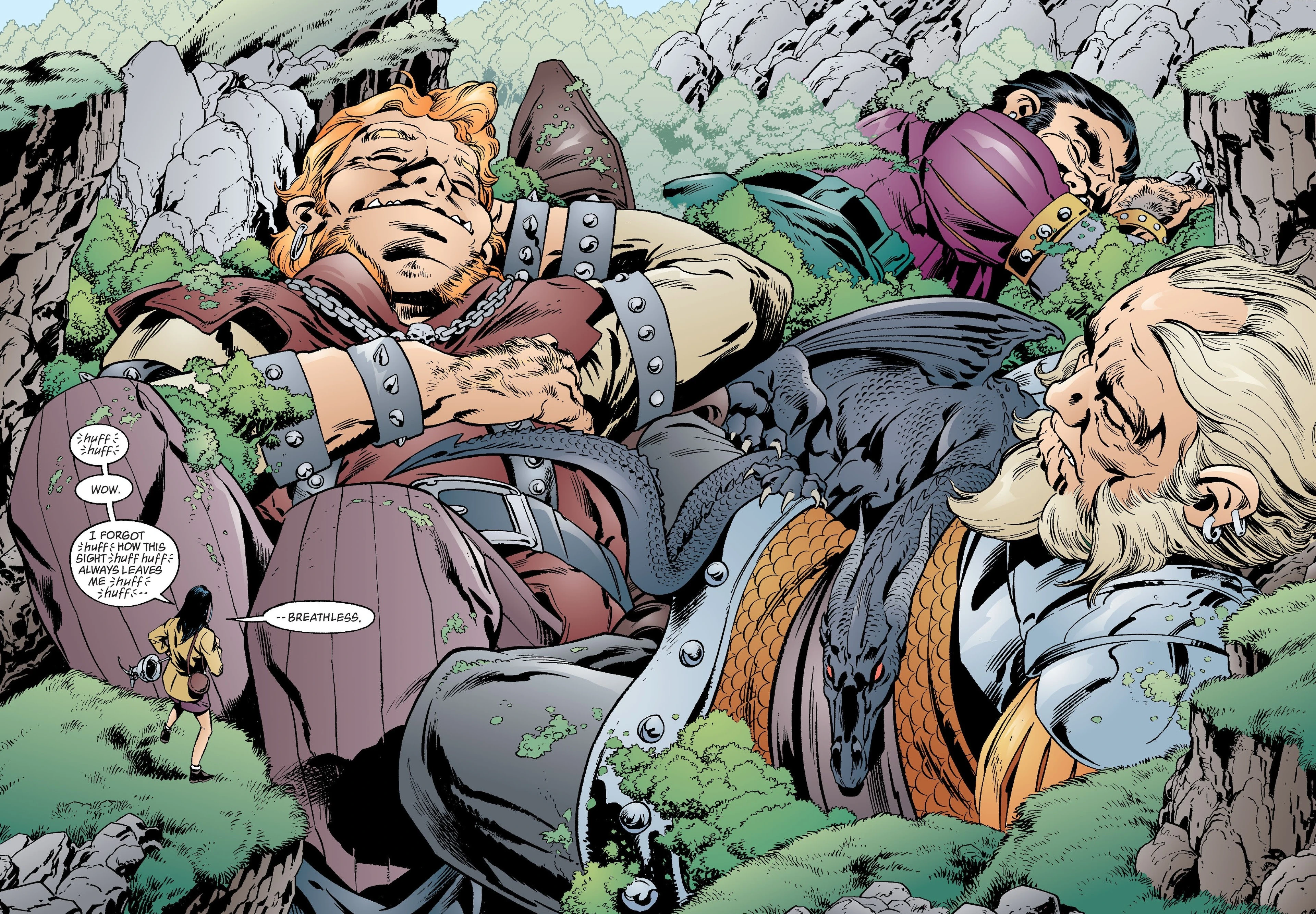 | A lindworm appears in Fables #107 — "Waking Beauty" and is a form of human-reptile hybrid. They are sturdier than humans; they can survive decapitation if their severed head is reattached to their body. | |