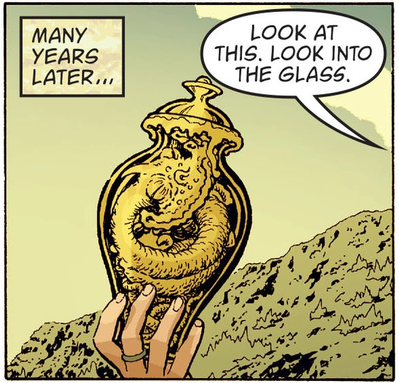 | The basilisk appears in Fables #142 — "The Last Sinbad Story," in which Sinbad ventures forth to claim an unidentified world in the name of his newly formed Pan Caliphate. He threatens to drop jars of basilisks, which are in a state of suspended animation, as living bombs upon the inhabitants; or alternatively, jars of cockatrice, salamanders, or other living weapons. If the glass shatters, the basilisks would be released, and everyone would be turned to stone, spending eternity in frozen awareness as living statues. | |