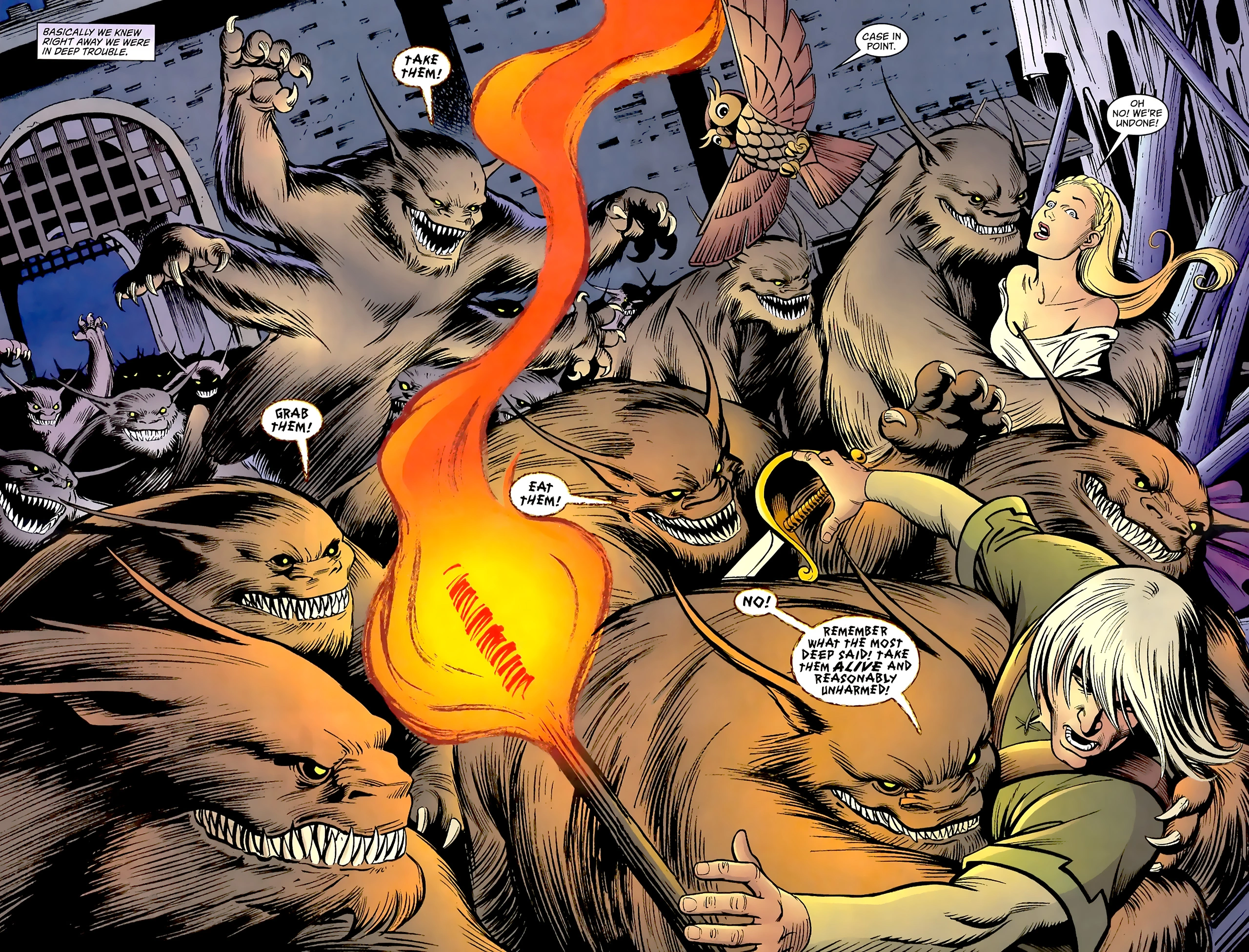 | Ogres are big, horned creatures who look similar to trolls, but are a separate species. They first appear in Fables #130 — "Junebug," where Junebug encounters one among the Fabletown residents moving into Castle Black. | |