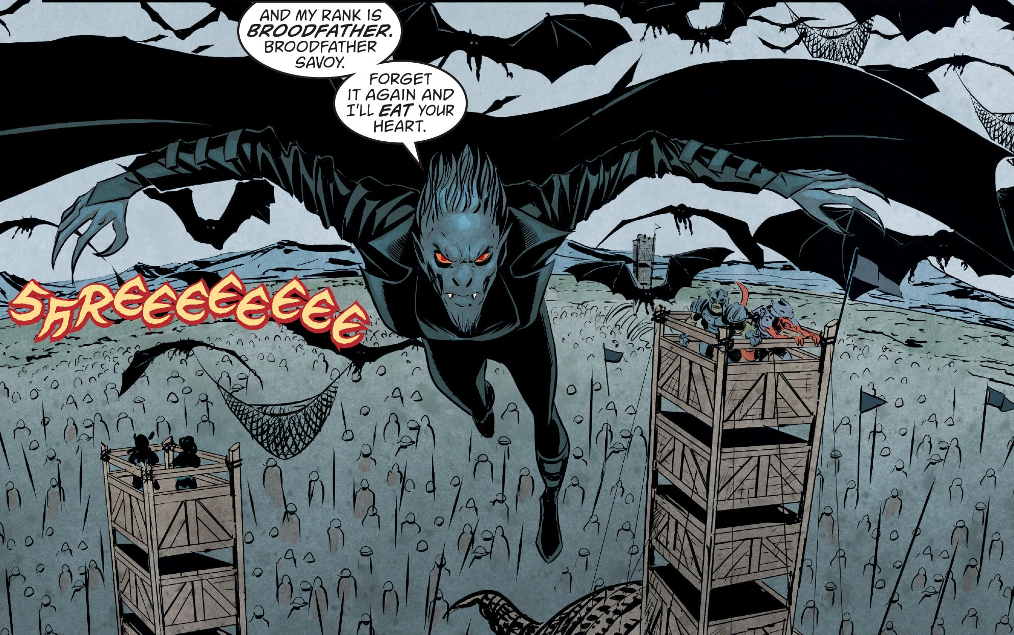 | Vampires[62] are first mentioned in Fables #12 — "A Sharp Operation: Part One of a Two-Part Caper" and first appear in The Unwritten #50 — "The Unwritten Fables, Part 1: The Summoning." They feed on human blood[63] and are believed to be fell spirits who have risen from the dead.[64] They do not have reflections[65] and can also transform into winged creatures resembling bats.[66] Sunlight is lethal to them.[63] | | ||