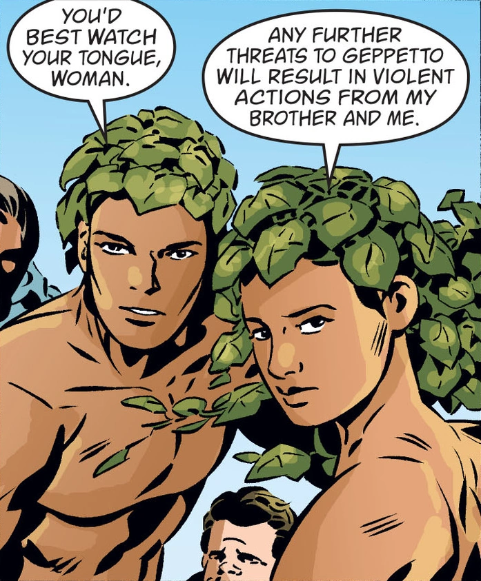 | Titans are first mentioned in Fables #104 — "F-Men!: Chapter Three of Super Team" and are powerful beings[59] who were imprisoned behind strong walls by the gods.[60] After Thumbelina joins Pinocchio's superhero team, she is given the supero title "Tiny Titan."[61] When the North Wind tries to explain to his son Bigby Wolf that it is in a wind's nature to change, he says that everyone, "from termite to Titan," is a slaves to their most basic nature.[59] Later, a disguised Tinker Bell confesses that she was the one who dumped the containment boxes in the mundane world, and makes a comparison to Titans who were imprisoned behind strong walls by the gods.[60] | |