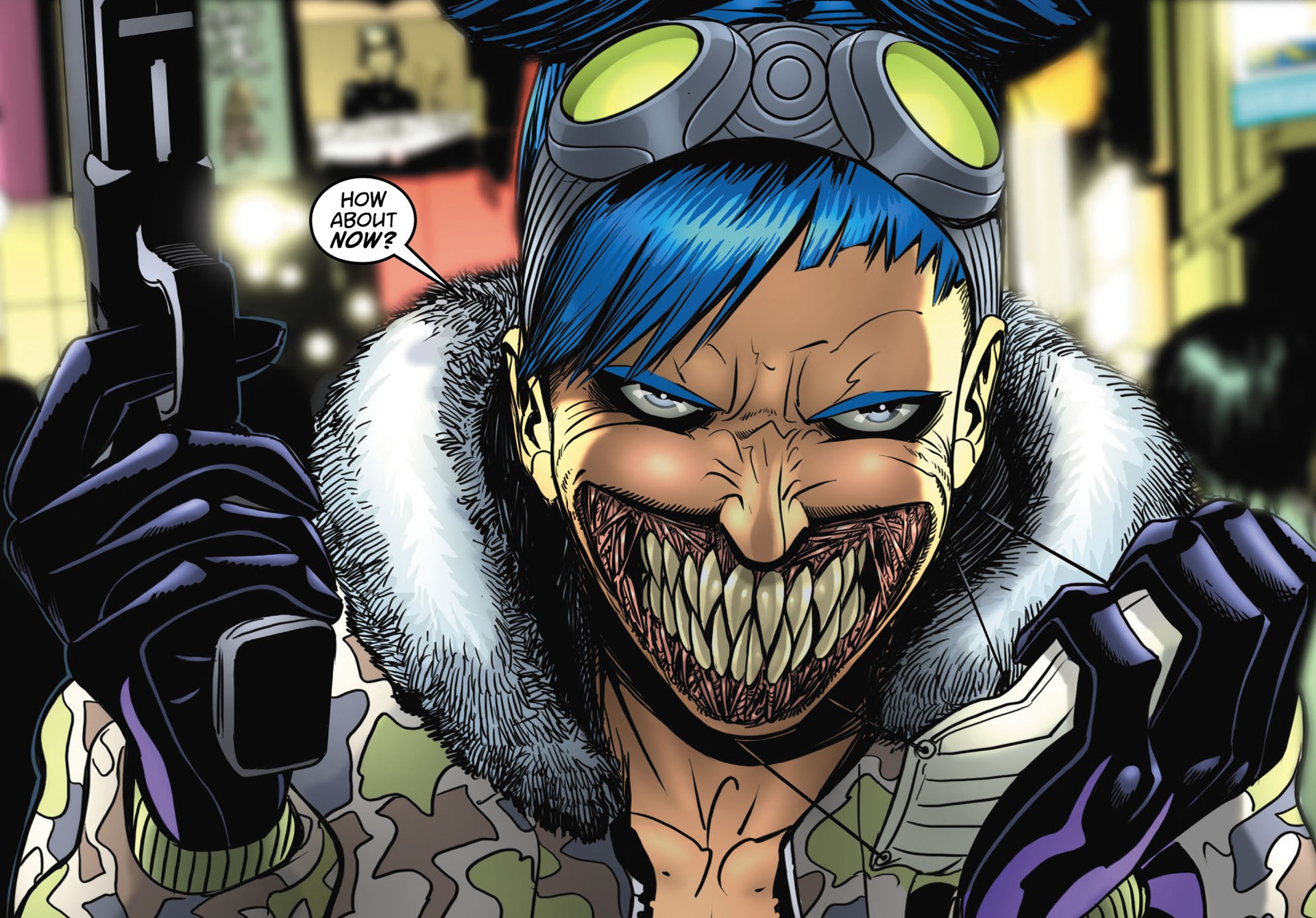 Prior to her disfigurement, Mayumi was a beautiful Japanese woman with long blue hair that she wore in two buns on the top of her head. Ryogan marred her appearance, drawing a deep slash from the edges of her lips to close to her ears, disfiguring her once lovely face. When she returned as a ghost, her face had morphed into something grotesque[2] with a wide, toothy grin and numerous sharp fangs lining her huge lipless mouth. The skin around her mouth was missing entirely, revealing the raw flesh underneath.[4] In modern-day Japan, she hides her disfigurement by wearing a face mask.[3][4][1]