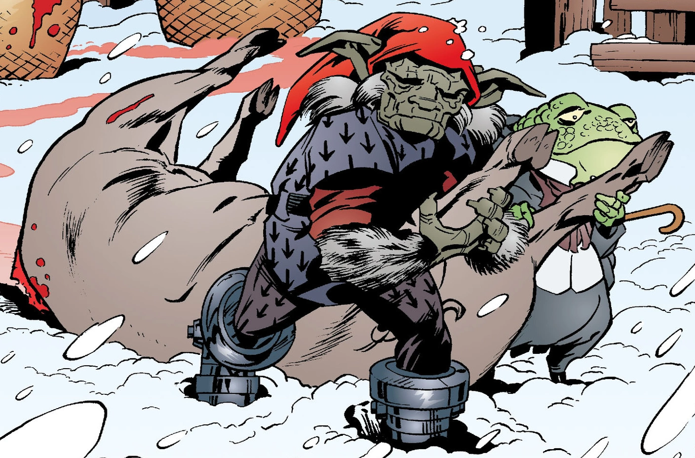 Toad readies himself with a rifle and joins a gathering outside the barn, along with the other animal Fables. During this meeting, Posey discloses the revolutionary group's intentions to secure transportation and launch an operation in New York City, with the ultimate goal of gaining control over Fabletown.[15]