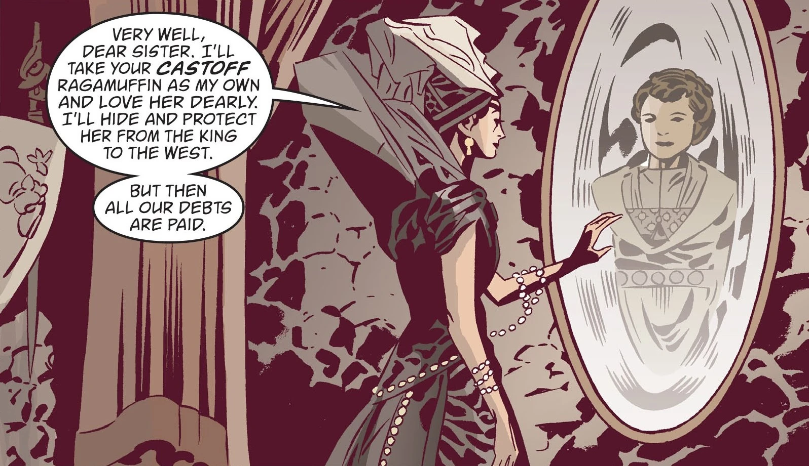 The Queen, whose name has never been revealed, was the ruler of the Silver Realm, and Snow White's and Rose Red's paternal aunt. She only appears in flashbacks from the Homelands, debuting in Fables #96 — "Snow White and the Seven Dwarfs, Chapter Three of Rose Red." After her husband's death, she became the sole ruler of his kingdom and "adopted" Snow White when she was still a child. Jealous of her niece's beauty, she tried to assassinate Snow White twice, ultimately failing both times.