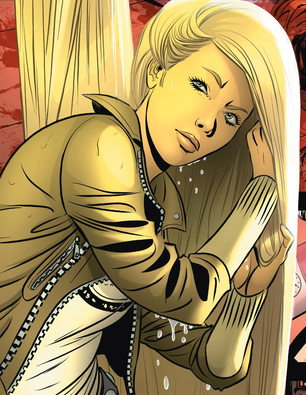 Due to her fast-growing hair, she is forced to live under the strictest mundy-contact conditions while in Fabletown, to prevent any of them from noticing the fast growth.[7][1] Joel of the Crow Brothers gives her three haircuts each day, at eight in the morning, four P.M. and at midnight. The hair is sold to make wigs, using the guise of her hair coming from many girls. However, she cannot live the lifestyle her income provides, since she cannot go out among the mundys for more than two or three hours at a time, and she cannot stay in a single place for more than 45 minutes. Her shopping trips must be confined to no more than twenty minutes per store, and she cannot visit the same store twice in three weeks. The same principle applies to almost every mundy business, with few exceptions; meaning that she cannot dine in any fine mundy restaurants, only in eateries with quick food service. She is allowed to watch movies at mundy cinemas because it's dark there, but she cannot talk to anyone.[1]