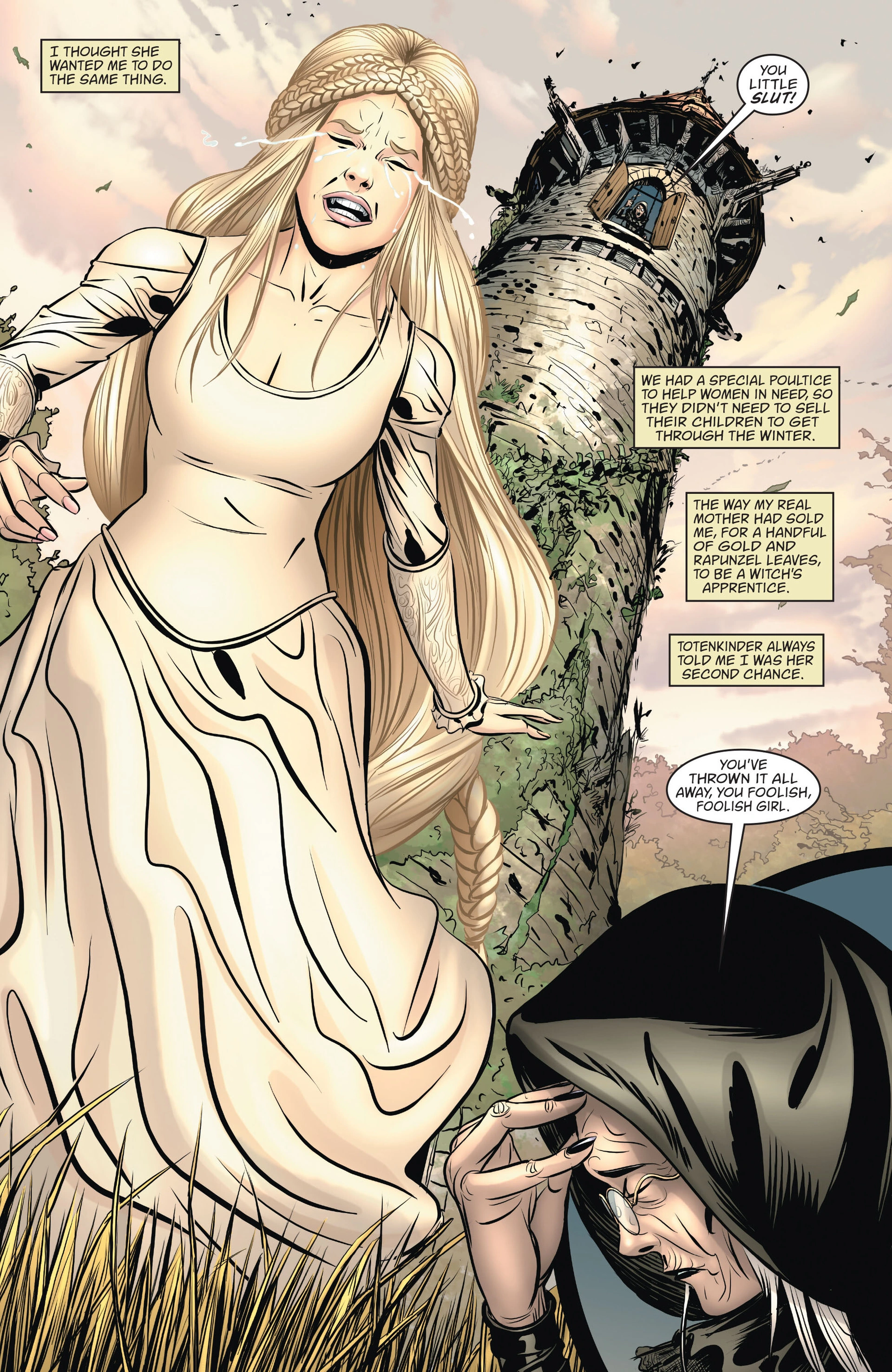 After being thrown out by Totenkinder, Rapunzel tried to find her lost lover. Unbeknownst to her, Cinderella's fairy godmother forbade the prince to contact Rapunzel again, as the godmother had "plans for her." No one would take the homeless Rapunzel in, because of her past as Totenkinder's ward. Left alone, Rapunzel was forced to deliver her babies on her own and would have died if an unknown woman had not assisted with the birth. During the labor process, the woman gave Rapunzel a drugged apple and stole Rapunzel's twin daughters away after telling Rapunzel her children had died. Assuming it was Frau Totenkinder who kidnapped her children, Rapunzel tried to confront her adoptive mother when she regained her strength. But the tower was gone, along with Frau Totenkinder. Rapunzel spent centuries looking for her daughters across a hundred worlds. She went to great lengths to find them, soon becoming a warrior and even killing a Minotaur, but never managed to locate her children.