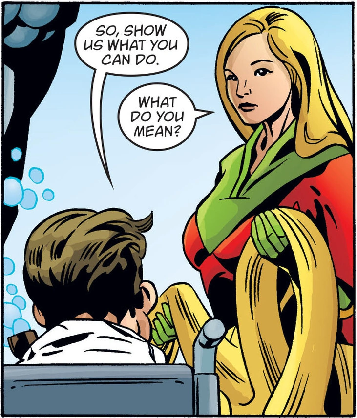 When Fabletown is under threat from Mister Dark, Rapunzel auditions for Pinocchio's superhero squad. He suggests a clever title for her name; "Hair Raiser" but spelled like "Hair Razor." She agrees with the idea. He poses the question if she could use her long tresses to handle objects, but Rapunzel says it is impossible and ponders why he would think such a thing. She then accuses him of using the costume fittings as an excuse to repeatedly watch her take off her clothes.[8]