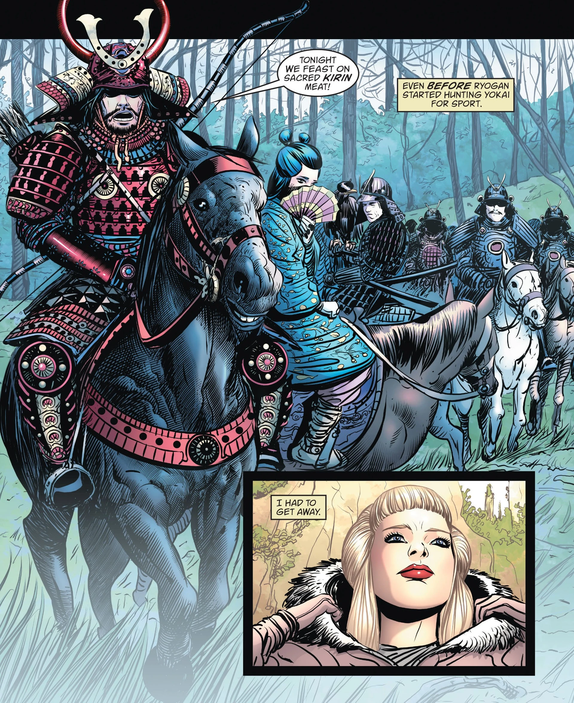 After Tomoko was taken away, Ryogan began using her foxfire to enforce his will and influence the Emperor to suit his interests. Secretly planning to become the new ruler of the Hidden Kingdom, he took an interest in Mayumi, a beautiful young courtesan at the Emperor's court. He offered to make her his Empress, but she rejected him and called him "a parasite on the court." Ryogan responded by slitting Mayumi's cheeks with his sword, so that no one would call her pretty again. He also started hunting yokai for sport.[3]