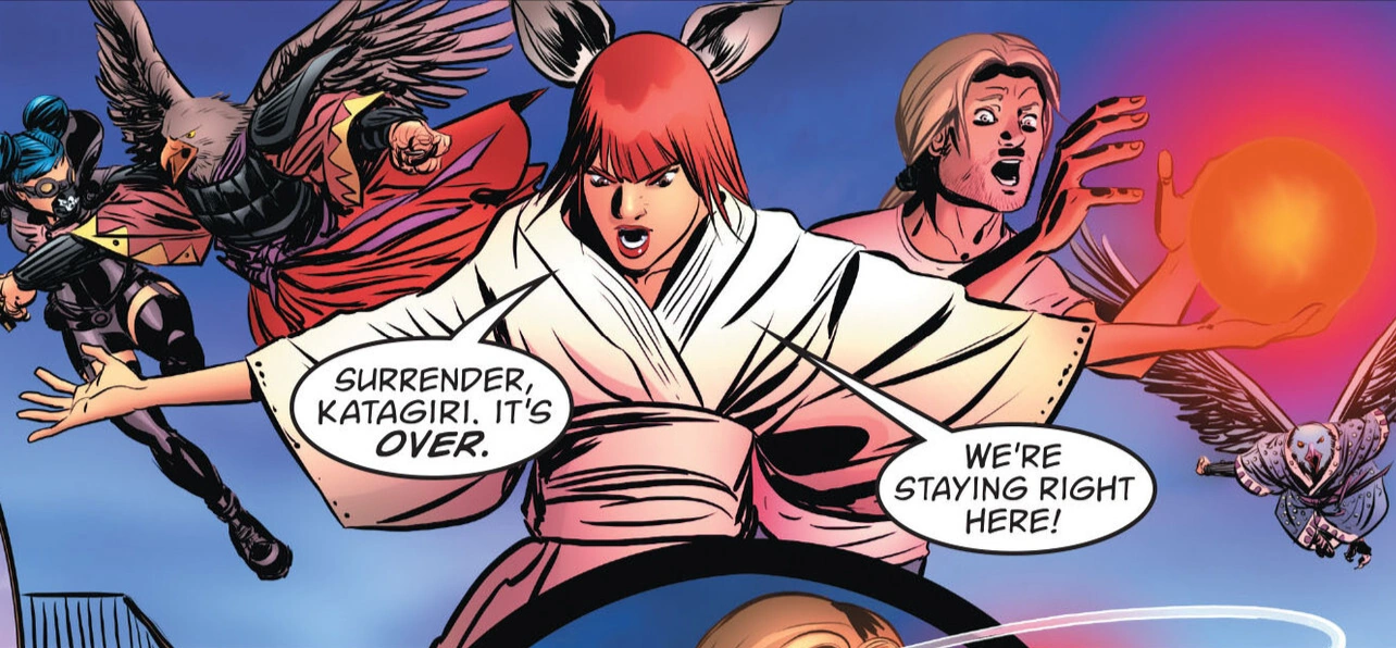 Tomoko is now the proprietress of the Celestial Entertainment Group, something of a front for her role as a Yakuza Obadan. The upstairs apartments of her building have been designated for Japan's Fables, its own version of Fabletown. Tomoko's Yakuza empire pays for the safe-housing of all Japanese fables, and though Rapunzel disapproves, she accepts it. She wonders whether it was Tomoko who sent the message about her children, but when she asks, Tomoko seems annoyed, explaining that Katagiri sent the origami birds to lure Rapunzel to Japan as a pawn in his plan to destroy everything that she has built.[1]