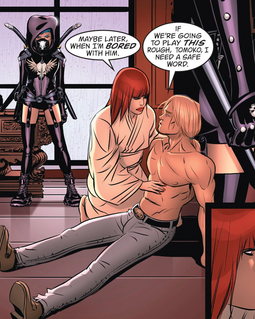 After Tomoko was taken away, Ryogan began using her foxfire to enforce his will and influence the Emperor to suit his interests. Meanwhile, Rapunzel travelled to the forests of the Hidden Kingdom, seeking out the hideaway of those yokai who were exiled, including Tomoko. Her former lover was sick, requiring her foxfire for her continued survival. She tasked Rapunzel with finding it in Ryogan's safe, which was protected by a puzzle lock. The plan had hinged on using the courtesan Mayumi to get close to Ryogan and get the foxfire herself, but overcome by depression at her disfigurement at his hands, she committed seppuku, a ritualistic suicide, even though she lived on as a ghost.[4]