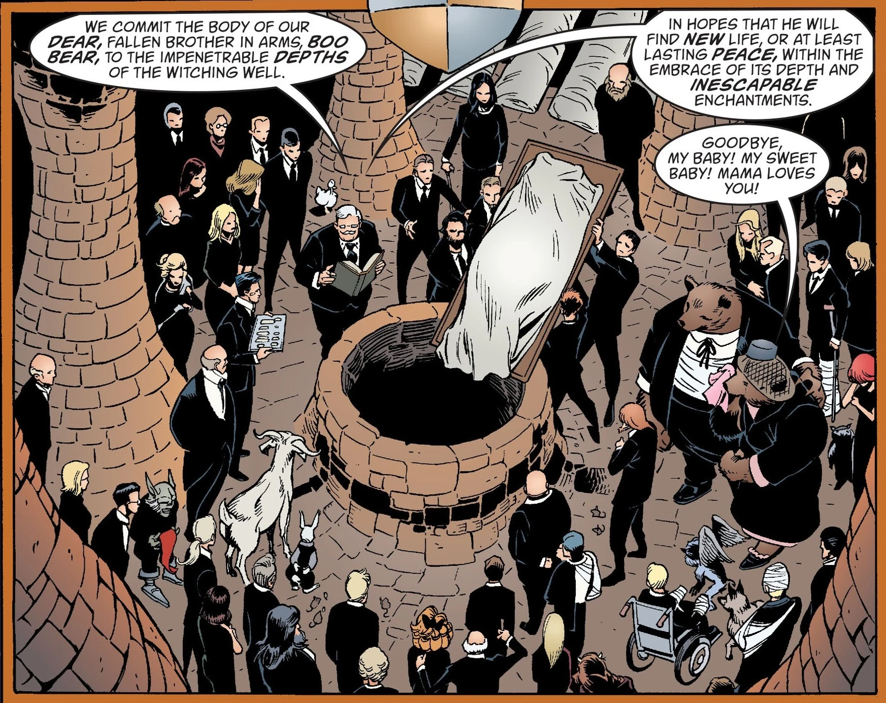 The Witching Well is located in a chamber inside the Woodland building, where it is used to dispose of things meant to be never seen again. Dead Fables are committed to its depths, as are the most unredeemable criminals. No one is entirely sure what lies at the bottom of the well, nor indeed if it has a bottom at all, but it is widely assumed to be the passage to the final resting place.