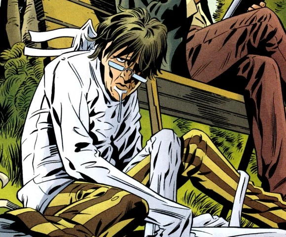 Writer's Block appearance is that of a disheveled man in a straight jacket. He seems to be in a vegetative state, unresponsive and drooling.